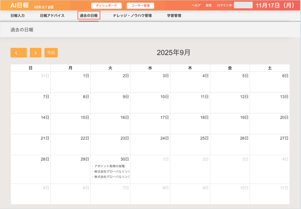 過去の日報をカレンダー表示で確認することができるようになりました。